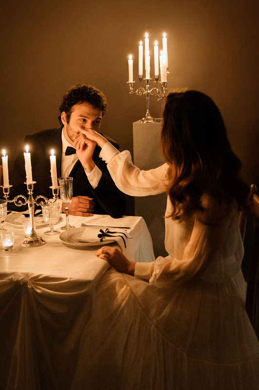 The bride’s makeup and hairstyle are essential elements for achieving perfect images. Candlelight has the power to soften the features, naturally blending shadows and creating an extremely flattering effect on the face. Soft waves in a vintage hairstyle, an elegant updo, or a boho-chic braid become more defined thanks to the play of light, while luminous details like hairpins, pearls, or rhinestones are delicately and sophisticatedly highlighted. To achieve a flawless hairstyle that stands out under candlelight, one can trust the expertise of Yuliya Mash, a professional in hairstyling. Additionally, for brides who choose natural and luminous makeup, candlelight is the perfect ally: the warm, golden reflection gives a healthy and radiant look, enhancing the skin without the need for excessive digital retouching.
